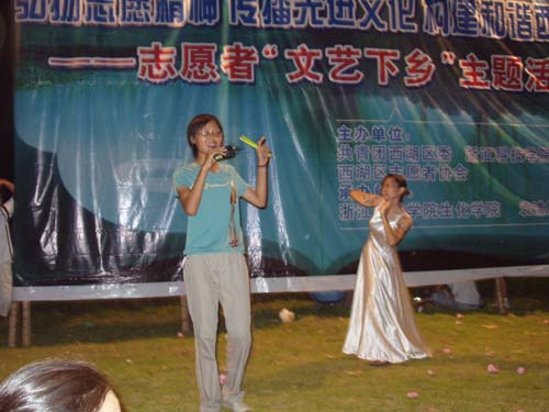 9月20日,结合保持共产党员先进性教育活动和加强团员意识教育活动,共青团西湖区委与共青团浙科院生化学院分团委联合主办“弘扬志愿精神 传播先进文化 构建和谐西湖”——志愿者文艺下乡大型文艺演出。本次活动得到了西湖区党委、区政府和袁浦镇镇委、镇政府的大力支持。西湖区团委书记高杨,副书记王志平,袁浦镇党委副书记、副镇长等观看了晚会。