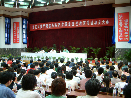 7月9日上午,学校在学院路校区召开保持共产党员先进性教育活动动员大会。校保持共产党员先进性教育活动领导小组组长、校党委书记徐志平作了题为“学在深处 干在实处 走在前列 办人民满意的高等教育”的动员报告。省属高校保持共产党员先进性教育领导小组指导联络组组长、省委教育工委干部处副处长林成格出席会议。校保持共产党员先进性教育活动领导小组副组长、校党委副书记胡浙平主持会议。教职工党员代表、离退休党员代表、民主党派负责人和无党派代表人士共300余人出席动员会议。