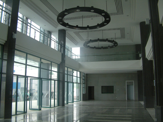 通过竣工验收的行政楼位于小和山校区C区,南靠留和路高教大道,西北紧临西蜜湖,建筑面积9744平方米,半地下车库,地上4层框架结构。行政楼外墙采用山东白麻光面花岗岩干挂,外立面水平、垂直方向嵌以深灰色铝塑板线条,突显行政楼的庄重。在行政楼南侧屋顶上有一白色钢构屋架与南入口大门雨蓬相呼应,站在行政楼西北侧屋顶花园上,西蜜湖的自然山水风光尽收眼底。行政楼四面围合的空间为景观内庭,南北两侧通透的入口将自然景观与内庭连为一体,楼内设多功能电梯。已竣工的行政楼即可交付使用,学校党政机关各部门将在这里集中办公,为广大师生提供服务。(图一为一楼大厅;图二为行政楼内庭;图三为行政楼北入口;图四为屋顶花园)