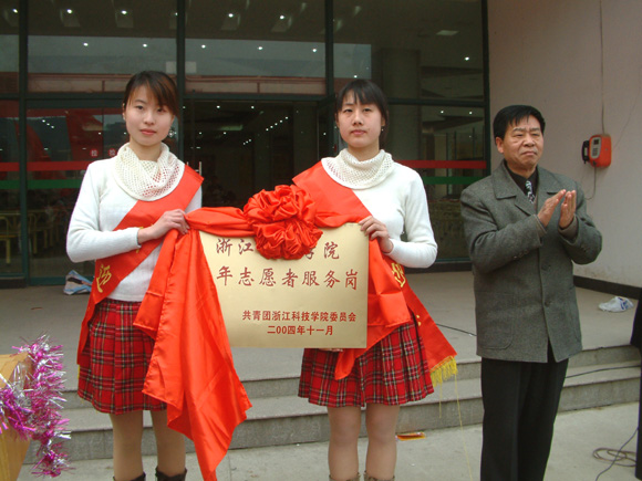 这一天,胡副书记在学生社区为“浙科院青年志愿服务岗” 揭牌,今后将在这里设长期服务点,在“奉献,友爱,互助,进步”的志愿者旗帜下,申搏共青团员将用他们的智慧和勤劳,把文明和进步献给社会,用他们的才华和友爱给需要帮助的人送去欢笑和希望。