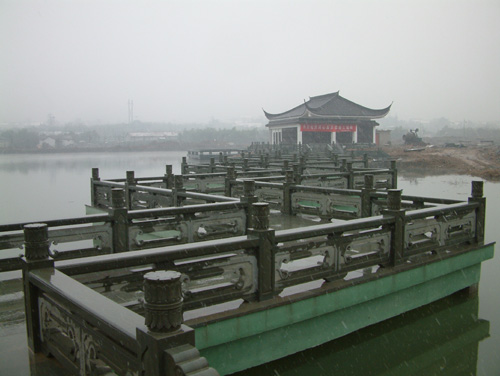 (图1为专家在计算机楼查验;图2为竣工后的信电管理楼;图3为信电管理楼局部;图4为湖心亭茶楼一角;图5为通向湖心亭的九曲桥;图6为竣工的中心广场)