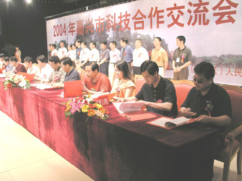 2004年嘉兴科技合作交流会于5月28~29日在嘉兴市举行。国家科技部、中科院、清华大学、浙江大学等全国15个省、市和22个城市的109所高校、科研单位的280余名专家学者现场与嘉兴市1000余家企业的代表进行交流。申搏领导蒋家新教授、科技处姜仕仁副处长、经管系张云博士以及科技处的同志应邀参加此次活动。