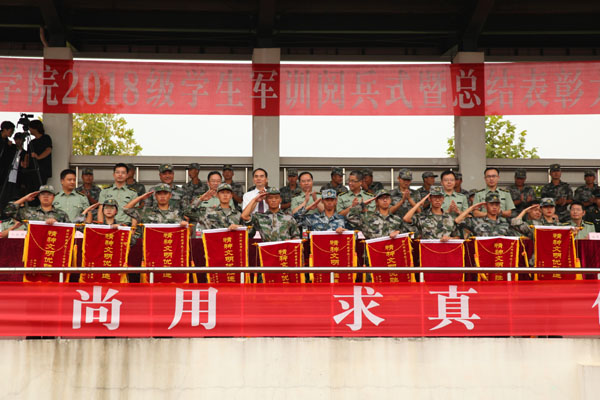 叶高翔检阅2018级学生军训团,并代表学校向中国人民解放军75210部队领导赠送锦旗。赵东福对本次军训做了总结。冯军宣读军训精神文明优胜连队、军训会操优胜方阵军训标兵、优秀学生教官名单、优秀辅导员。与会领导为军训嘉奖人员颁奖。