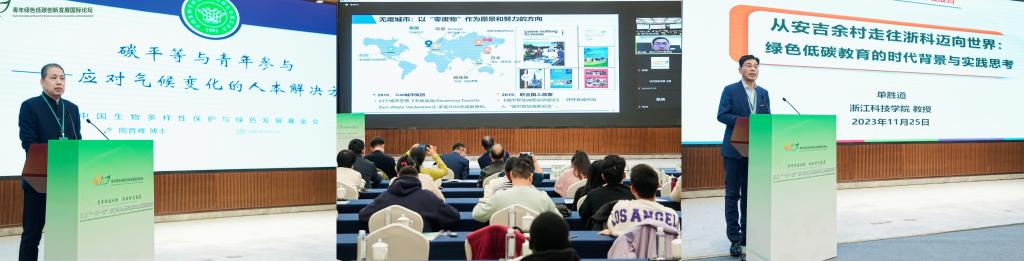 特邀报告阶段,世界艺术与科学院院士、中国绿发会副理事长兼秘书长周晋峰作题为《碳平等与青年参与》的报告,清华大学温宗国教授作题为《“双碳”目标下循环经济发展动态及工程实践创新》的报告,单胜道作题为《从安吉余村走往浙科迈向世界:绿色低碳教育的时代背景与实践思考》的报告。与会专家围绕“绿色低碳与可持续发展”“绿色低碳技术与产业创新”进行分享。20位青年学子聚焦绿色低碳创新发展领域广泛开展交流探讨。
