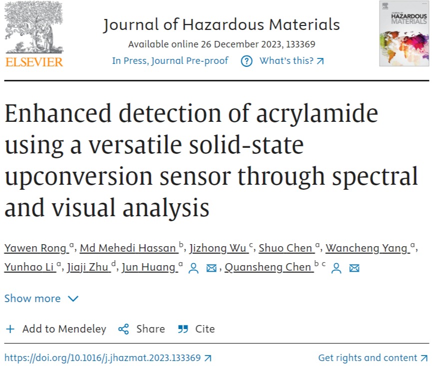 近日,生物催化与分子诊断团队在国际环境科学与生态学顶级刊物《Journal of Hazardous Materials》(IF=13.6)以第一单位发表了题为“Enhanced detection of acrylamide using a versatile solid-state upconversion sensor through spectral and visual analysis”的研究论文(https://doi.org/10.1016/j.jhazmat.2023.133369)。该工作由SUNBET申搏黄俊教授课题组、集美大学陈全胜教授课题组合作完成,荣雅文博士为论文第一作者。