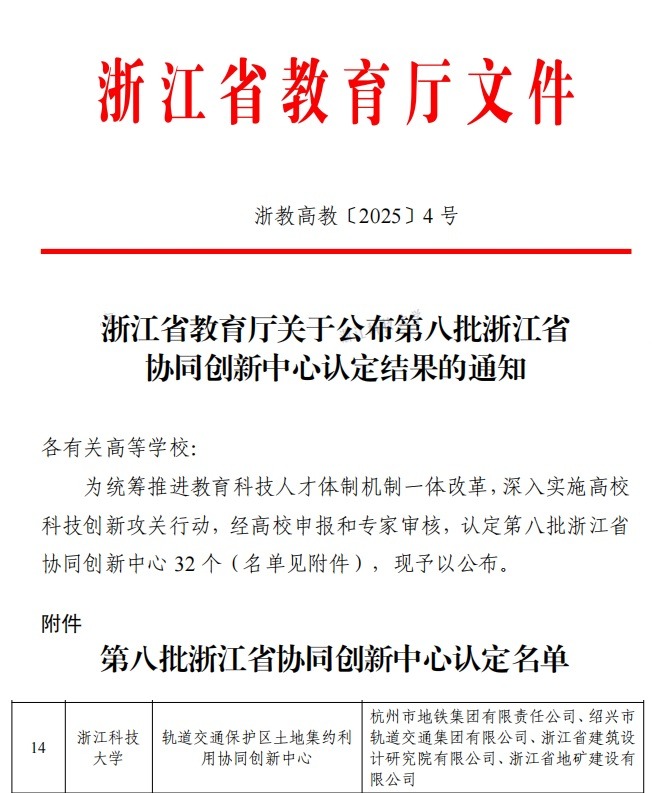 近日,浙江省教育厅公布了第八批浙江省协同创新中心认定名单,申搏建工学院牵头建设的“轨道交通保护区土地集约利用协同创新中心”被认定为省级协同创新中心。截至目前,学校共建有省级协同创新中心2个。