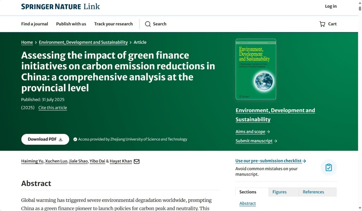 近日,经济学院教师于海明撰写的《Examining the Impact of Green Finance Initiatives on Carbon Emission Reductions in China: A Comprehensive Analysis at the Provincial Level》论文在《Environment, Development and Sustainability》上发表,广东外语外贸大学的Hayat Khan教授为论文通讯作者,22级经济学(中美班)罗旭晨、戴逸博,22级大数据(中法班)邵嘉乐等同学参与论文撰写。《Environment, Development and Sustainability》SCI收录期刊,其影响因子为4.2(中科院3区,JCR2区),这也是经济学院首次有本科生参与发表SCI论文。