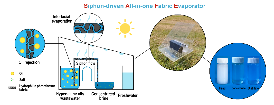 团队在胶体与界面科学领域高水平期刊Journal of Colloid and Interface Science上在线发表了题为“Siphon-driven all-in-one fabric evaporators for multi-purpose treatment of hypersaline oily wastewater”的论文(点击阅读),2023级硕士研究生李响为该论文第一作者,黄俊教授、邓然博士与浙江大学杨皓程研究员为论文通讯作者。SUNBET申搏为第一单位。工业高盐含油废水因其成分复杂、处理难度大,一直是环境治理领域的一大难题。传统处理技术,如反渗透、膜蒸馏等,常面临膜污染以及盐分回收困难等瓶颈。生物催化与分子诊断研究团队创新性地开发出一种耦合单向虹吸流动与太阳能驱动蒸发的一体化纤维蒸发器(SAFE),巧妙集成截留、蒸发与浓缩过程,实现了高盐含油废水中油、水与盐的高效分离与资源化回收,为工业废水处理提供了极具潜力的创新解决方案。本研究通过贻贝仿生沉积技术,制备出兼具优异亲水疏油特性和高效光热转换能力的亲水光热纤维膜。纤维膜利用其优异的亲水性实现对油滴的有效截留,并通过虹吸效应实现盐溶液在纤维内的自发、定向传输。在太阳光驱动下,水分快速蒸发并经冷凝后回收得到清洁淡水。与此同时,浓缩后的盐水在纤维出口端被及时导出,此设计有效抑制了盐分结晶对蒸发过程的阻碍问题,进而实现了高效、持续的蒸发性能。实验结果表明,SAFE系统展现出卓越的蒸发效率和油水分离能力。在一个太阳光照下,SAFE蒸发速率可达2.19 kg·m-2h-1,盐分浓缩1.57倍,油水分离效率突破99.8%,户外实验也进一步证实了其优异的抗污性和长期稳定性。