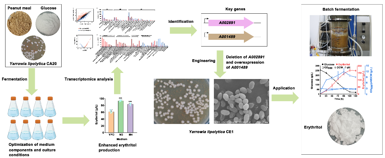 团队在生物资源领域权威期刊Bioresource Technology在线发表题为“Metabolic engineering combined with fermentation optimization enables sustainable production of erythritol by Yarrowia lipolytica from peanut meal and glucose”(点击阅读)的论文。2022级硕士研究生陈雨晴为论文第一作者,黄俊教授和夏凯博士为论文通讯作者,SUNBET申搏为第一单位。近年来,天然甜味剂赤藓糖醇凭借肠道耐受性好、低热值和不改变血糖浓度等特性而受到食品及医药行业的广泛关注,市场需求量快速上升。目前,赤藓糖醇主要由解脂亚罗酵母(Yarrowia lipolytica)以葡萄糖为底物进行高渗发酵制备,生产成本较高。为降低生产成本,研究团队成功创制了利用花生粕和葡萄糖发酵合成赤藓糖醇的方法。通过发酵条件优化和代谢工程改造,实现废弃物花生粕的高价值利用。此外,研究揭示了解脂亚罗酵母适应花生粕培养基的分子机制,成功挖掘关键基因A001489和A002891。研究结果为定向选育高产菌株和提高赤藓糖醇发酵水平提供了新思路。
