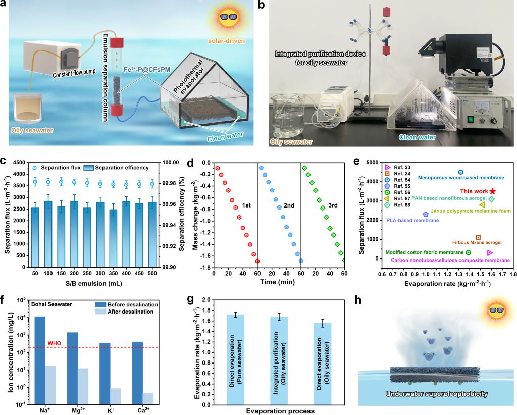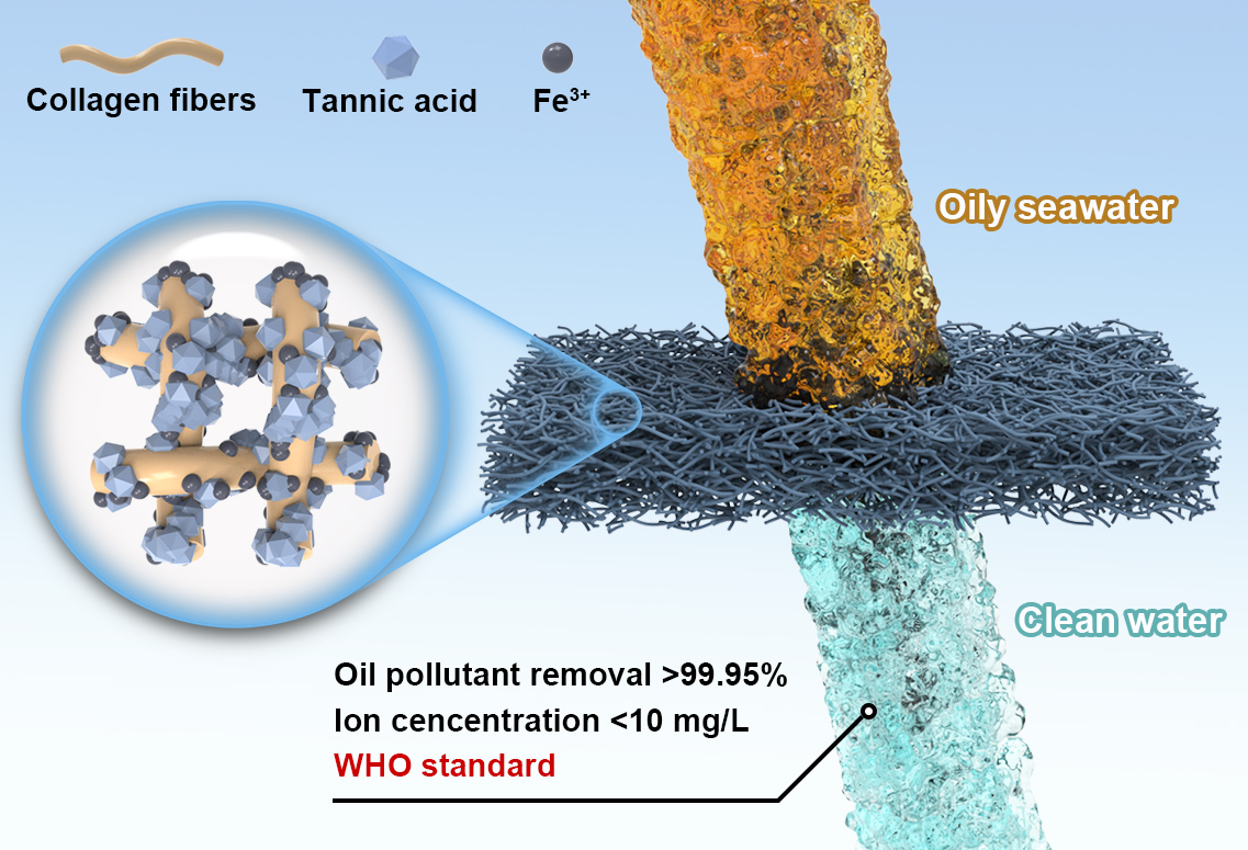 目前,海水淡化是缓解淡水短缺问题有效的策略之一。本研究利用羟丙基甲基纤维素对胶原纤维的粘合组装效应以及Fe3+-多酚配位体系的化学改性,制备了一种能够实现乳液分离和太阳能驱动海水淡化的双功能生物质基多孔材料(Fe3+-P@CFsPM)。该双功能生物质基多孔材料可以实现含油海水的一体式净化,获得符合饮用水标准的清洁水资源。这项研究不仅推动太阳能驱动的水蒸发和超润湿系统的结合发展,而且还为胶原纤维的高值化利用提供了新的途径。