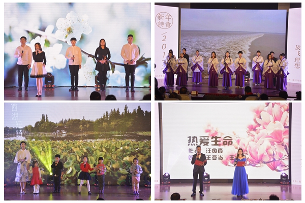 诗会共分为三个篇章:与子共煮茶、杭城藏佳话、理想筑华夏,每个篇章都风采各异。表演者倾情朗诵了十余首诗歌,充满韵味的《诗经》组诗开篇,《四月的纪念》告诉你,这份深情如何用委婉而不失真的语言,在看似平淡的生活里摩擦情意。《凤凰涅槃》字句铿锵气势磅礴,仿佛凤舞九天,涅槃于眼前;小朋友们稚嫩声线描绘的《西湖短诗》,合诵《观浙江涛》气势如潮,《我们正年轻》和《追梦青春》绽放青春之花;新解《岳阳楼记》意味悠长;《我的南方和北方》展现祖国大好河山。在一曲《新年祝福》中2017年的新年诗会走向尾声。(学生记者 夏馨/文 学生记者 杨国灏,齐世发/摄)