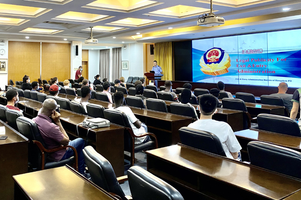 杭州市出入境管理局负责人向国际师生开展我国法律法规知识宣讲,并介绍疫情期间的相关政策。普法教育讲座贴近国际师生生活主题,生动的案例吸引师生的强烈兴趣。讲座现场,师生还就自己关心的问题与杭州市出入境管理局负责人进行沟通。