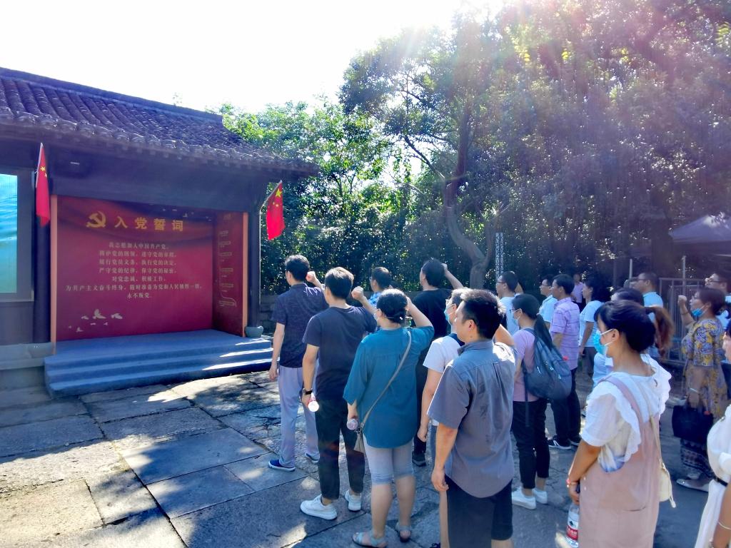 全体教工党员在绿堤东门广场,由学院党委书记张掬婴领誓,面对党旗,一起举起右手,重温入党誓词。