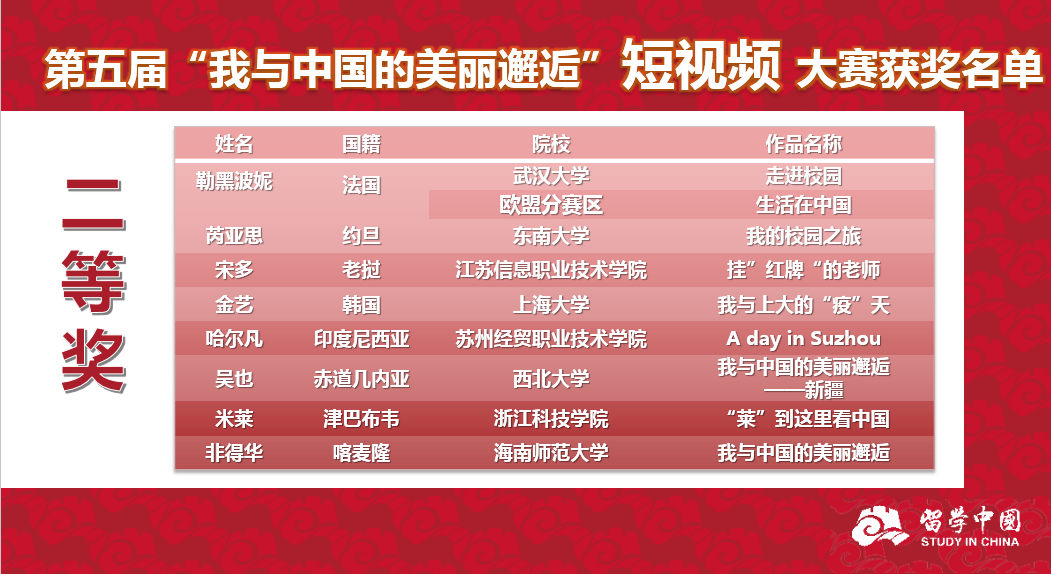 12月21日,第五届《我与中国的美丽邂逅》来华留学生征文暨短视频大赛颁奖典礼以线上形式举办。在此次征文大赛中,申搏留学生获全国优秀奖1项,全国特色奖2项,其中优秀奖作品被同步出版的《我与中国美丽邂逅》录用,;在“我与中国的美丽邂逅”短视频大赛中,获全国二等奖1项、三等奖1项;学校获全国“优秀组织奖”。