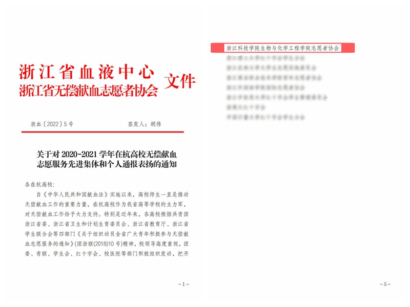 近日,浙江省血液中心、浙江省无偿献血志愿者协会发出通报,表扬在2020-2021学年无偿献血活动中表现突出的志愿服务先进集体及先进个人,生化学院志愿者协会获评无偿献血志愿服务先进集体,周文晟获先进工作者、材料科学与工程19级陆洪婧、张竣峰获杰出志愿者,食品科学与工程19级王博、梁德鸿、陈春叶、 徐斐嘉、杨羽思获优秀志愿者。
