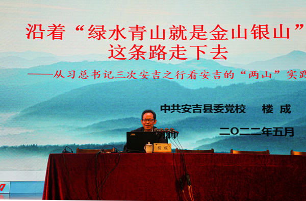 开班仪式后,楼成为本期学员带来第一讲《从美丽乡村到美好城市》专题讲座。他以习近平总书记三次安吉之行为切入点,详细地梳理了安吉“两山”理念发展的时间轴、实践轴、理论轴、认识轴、目标轴和阶段轴。楼成娓娓而谈,以实践案例贯通理论路径,以基本经验阐述内在逻辑,以生态理念诠释时代内涵,展现出深厚的理论功底和丰富的实践经验。同时,他从学生可以理解和接受的视角,带领学生深刻理解“绿水青山就是金山银山”的丰富内涵和现实意义。学员反应热烈,掌声不断。