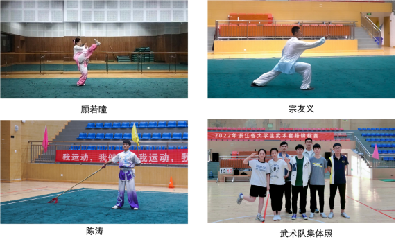 5月27日至29日,2022年浙江省大学生武术套路锦标赛举行,申搏武术代表队7名运动员在教练员周新新老师的带领下参加本次比赛。经过3天紧张激烈的角逐,最终来自机械与能源工程学院的宗友义同学获得男子甲组太极拳、太极剑第三名;信息与电子工程学院的赵志琦同学获得男子甲组棍术第五名;经济与管理学院的王昊同学获得男子甲组枪术第六名;环境与资源学院的赵家漩同学获得男子甲组太极剑第七名、太极拳第八名,宗友义被授予优秀运动员称号,男子团体总分排名第六。