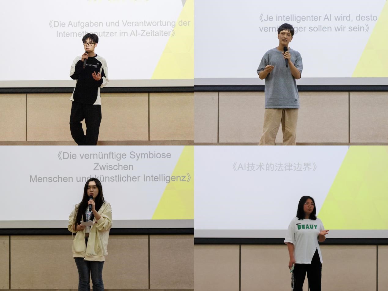 点评提问环节,评委老师针对参赛者演讲内容作点评提问,考察参赛选手对论题的理解程度,指引学生作进一步思考。选手们从容应答、侃侃而谈,敏捷的思维和自然流畅的回答得到评委的认可和观众的阵阵掌声。(中德学院 黄骅)
