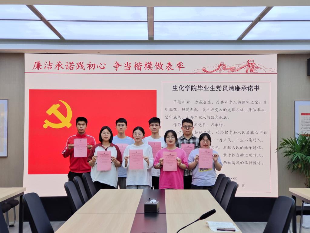 生化学院生物工程专业学生党支部毕业生党员陈宇菱深有感触地说,这次主题党日活动很有教育意义,以廉洁承诺、宣誓的形式让我们毕业生党员感受到重任在肩,我们要带着一身清风,带着学院“三实”精神,奔赴岗位,一心为公、一身正气、一尘不染建功立业。(生化学院 付阳)