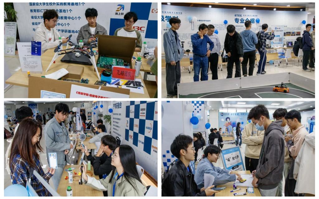 活动中,学院表彰了在大学生科技竞赛及科技创新活动的优秀指导教师、优秀大学生及大学生科技竞赛优秀俱乐部。“超声波水声通信、无人机、可见光小屋、盲人导航车、无人自动驾驶小车、Lidar云台点云扫描”等一系列学生科技创新作品在各展位上轮番展出,揭示了科技在生活中无处不在的美感。此外,活动现场还设置了多种妙趣横生的互动游戏及教职工“趣味运动会”,如1024秒挑战、代码连连看、“码”绘心声、速忆闪电战、“码”术不一致等,通过集章式的闯关打卡形式吸引众多参与者。