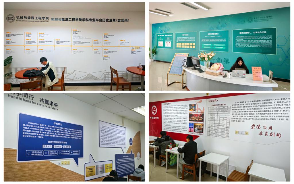 在机械学科库内,学科墙上不仅直观展示机械与能源工程学院的成果,还展望现代技术的未来趋势,激发着读者对科技创新的热情。在化工学科库,墙面上生动地展示了生物与化学工程学院的学科申搏、发展历史、办学条件、成果特色,以及学科领域名人语录等,让人感受到了生化学科的独特魅力。轻工学科库则通过学科墙展示了环境与资源学院在生态修复和绿色低碳生态环境科技人才培养方面的努力,学院通过学科交叉融合,积极应对当前和未来的环境挑战。在语言学科库,墙面展示教师队伍、国际交流与合作成果,读者们在这里不仅能学到丰富的语言知识,更能领略到不同文化的魅力。