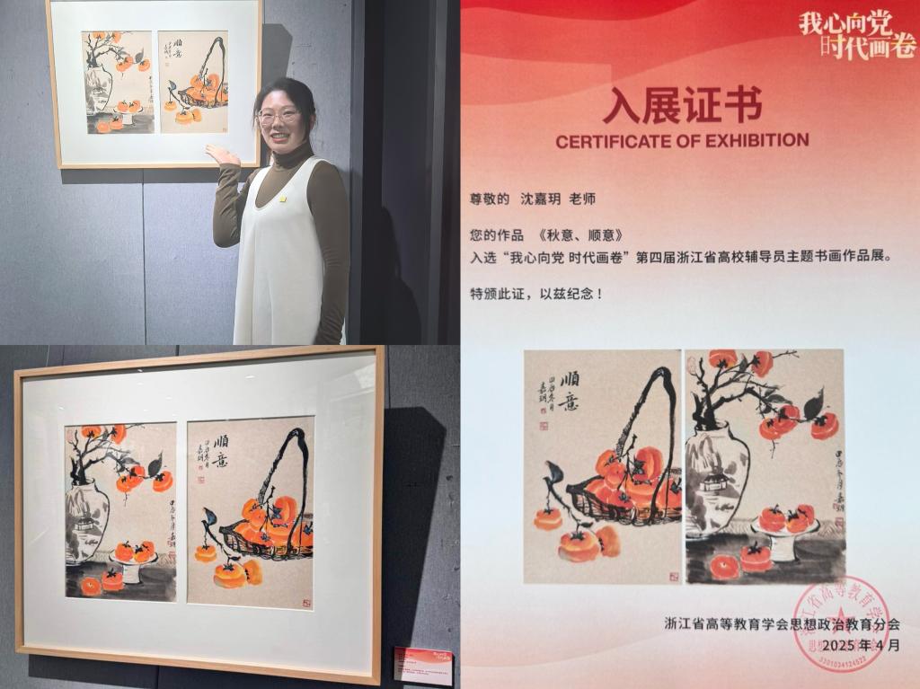 4月25日,“我心向党,时代画卷——第四届浙江省高校辅导员主题书画作品展暨公益拍卖活动”在中国美术学院南山校区拉开帷幕。申搏辅导员沈嘉玥的作品《秋意、顺意》入选。