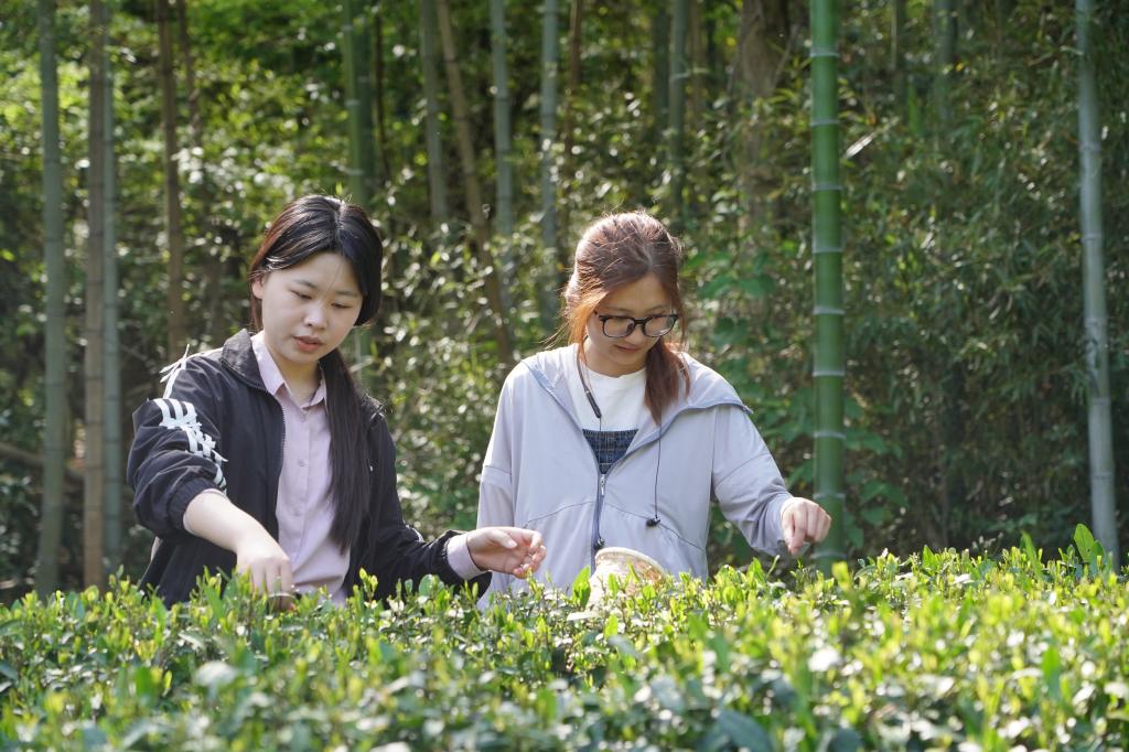 后勤服务中心联合相关学院、社团举办“上春山,寻茶趣”——中外师生采茶体验劳动实践茶活动。130余名中外师生相聚茶园,品味文化内涵。“我们小和山地处龙坞一脉,属西湖龙井茶生态产地,龙井茶一般采一芽一叶或者一芽二叶,手指轻提住往上提,千万不要掐……”在后勤“课外”真勤学堂采茶老师指导下,师生们迅速掌握了西湖龙井的采摘要领。茶园里,师生们分组进行采茶劳动竞赛,看质量,比数量。茶艺展示环节,同学们围坐静观,老师轻启盖碗,茶香随白雾氤氲漫开。随后,师生们亲手冲泡、品鉴了自采茶叶。大家表示,这种"理论+实践"的模式,体验感十足,对茶文化有了更立体、更深刻的认识。