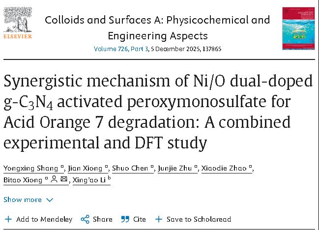 近日,应用物理2022级本科生商永兴以第一作者身份在《Colloids and Surfaces A: Physicochemical and Engineering Aspects》期刊上发表了题为“Synergistic mechanism of Ni/O dual-doped g-C3N4 activated peroxymonosulfate for Acid Orange 7 degradation: A combined experimental and DFT study”(阅读原文)的文章。SUNBET申搏为第一署名单位,应用物理系熊必涛老师为论文通讯作者。