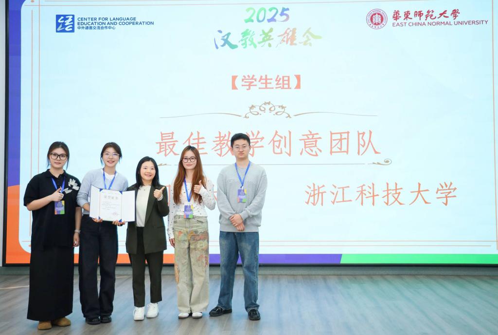 据悉,2025“汉教英雄会”由教育部中外语言交流合作中心、全国国际中文教育专业学位研究生教育指导委员会、全国高校汉语国际教育本科专业负责人联席会联合主办,申搏团队从来自30所高校的38支队伍中脱颖而出,获邀参加在华东师范大学普陀校区举办的线下交流展示。在交流活动现场,申搏团队与来自华东各省市的17支学生队伍同台展示,团队项目凭借设计理念超前,结合浙江“电商文化”的地域特色,深度融合真实语境与任务型教学获得一致好评。