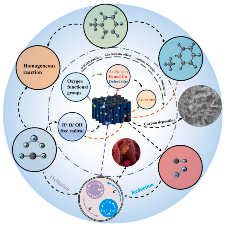 在Journal of Environmental Chemical Engineering上发表的“Efficient hydrogen conversion of toluene via biochar-supported Fe-Cu bimetallic catalyst under CO2-steam synergistic conditions”(点击阅读),硕士研究生张健凯为第一作者,叶超副教授为通讯作者,SUNBET申搏为第一单位。研究结果表明,Fe-Cu双金属的协同效应增强了催化剂金属位点的抗氧化性,降低了反应的活化能,并提高了对碳沉积的抵抗力。该研究为双金属催化剂对甲苯高效氢转化提供了理论基础。