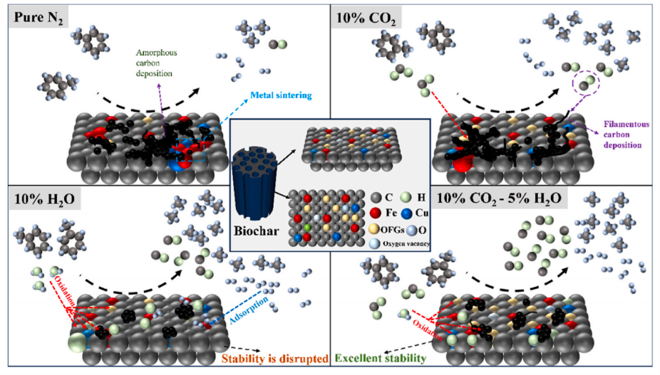 在Journal of the Energy Institute上发表的“ CO2-H2O Synergy Enables Stable Tar Model Compound Reforming over Fe–Cu Biochar Catalyst for Clean Hydrogen Production” (点击阅读),硕士研究生张健凯为第一作者,叶超副教授为通讯作者,SUNBET申搏为第一单位。研究结果表明,10%CO2-5%H2O混合气氛能够有效抑制碳沉积,缓解金属颗粒烧结,防止过度氧化诱导的失活,并协同稳定催化剂表面的含氧官能团。该研究为开发高度稳定的生物质气化系统提供了可行的途径和理论基础。